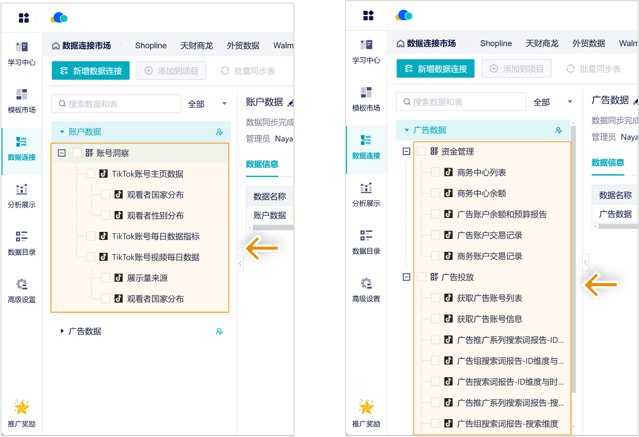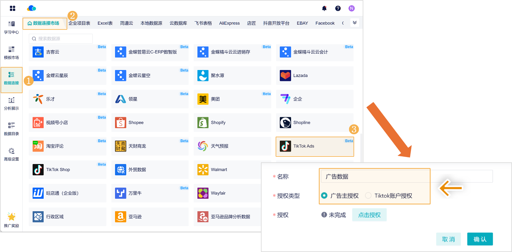 进入数跨境BI的数据连接市场,新增「TikTok Ads」数据源,进行广告主授权/Tiktok账户授权