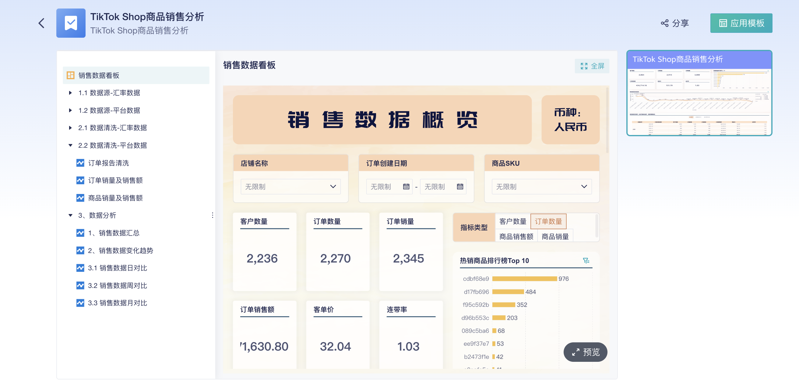 开了很多个TikTok Shop,上架了很多款商品,该怎么综合查看商品销售情况?使用数跨境BI进行商品销售分析,只要接入Tiktok Shop订单报告数据,就能自动更新和计算销售数据: