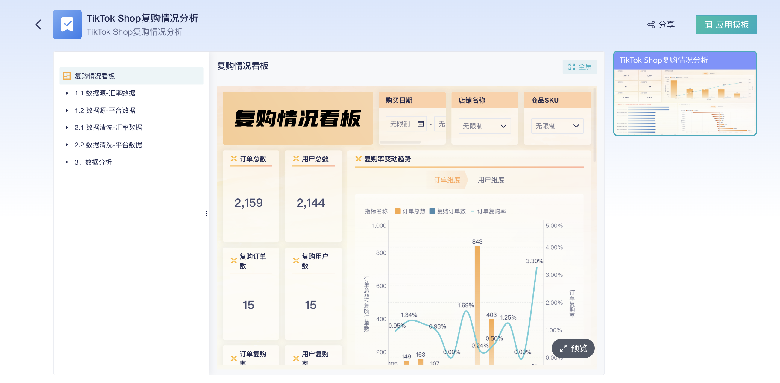 目前TikTop普遍存在的问题是转化率低,难以产生复购,常见的引流方式有两种:tiktok+独立站或者tiktok+私域。如果你的TikTop Shop商品是日用品或者消耗品,具有回购特性,那么可以使用数跨境BI进行复购分析: