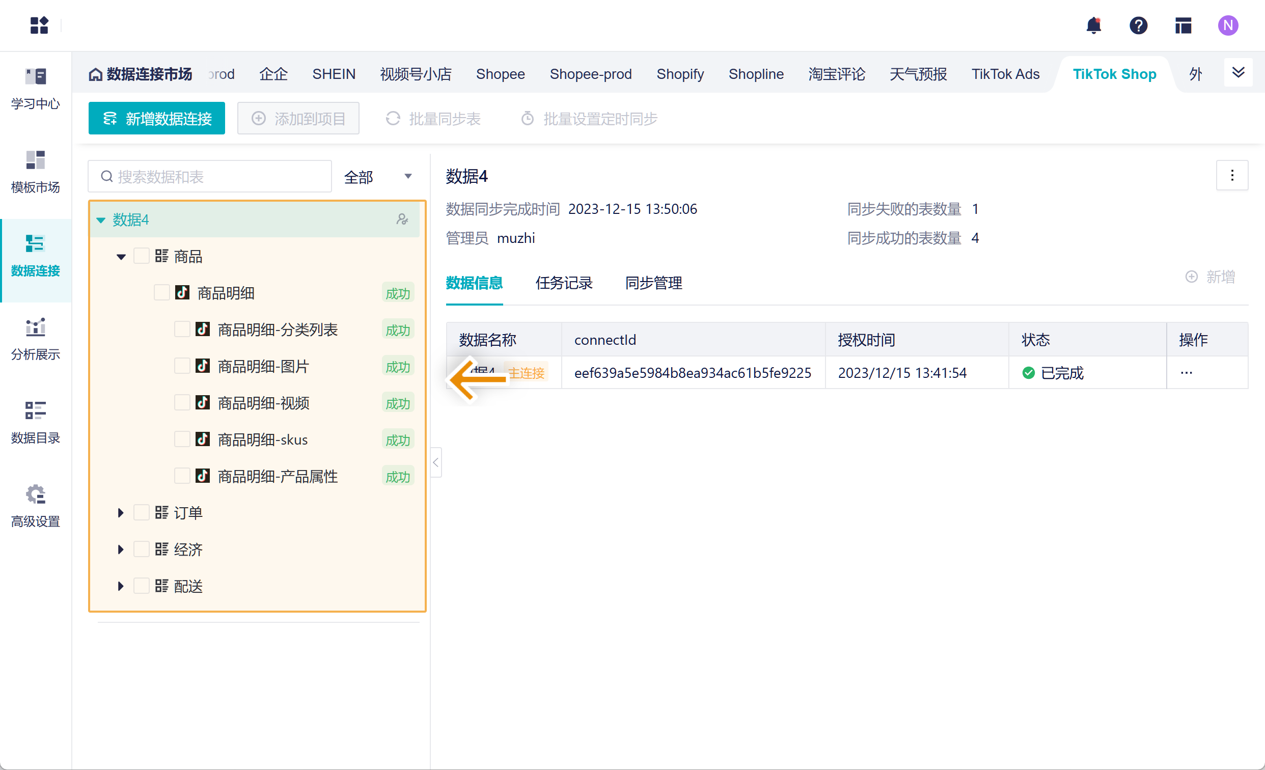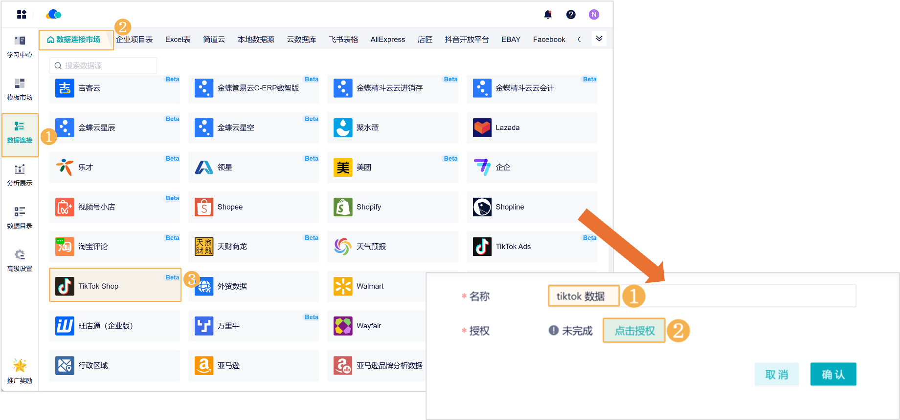 首先,进入数据连接市场,新增「TikTok Shop」数据源,点击授权即可进入授权页面