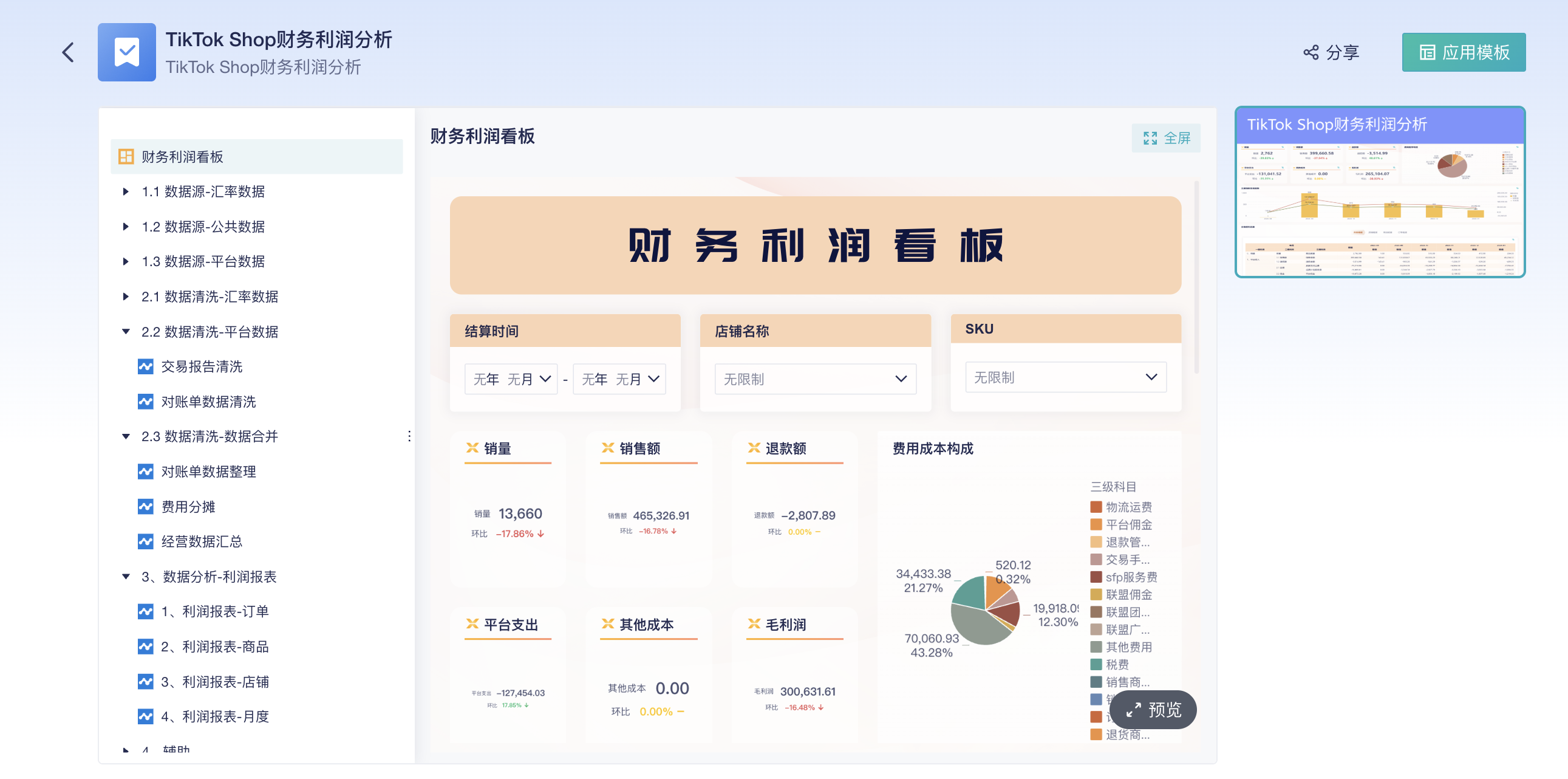 TikTok平台的站点多、账号多、店铺多、成本结构复杂,利润分析难度大。数跨境BI: