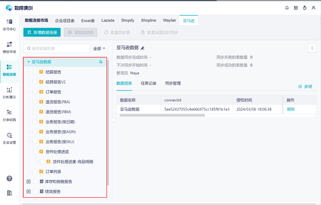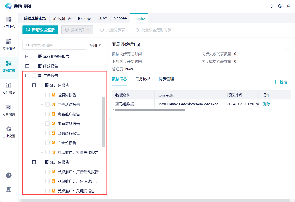 只要把这几列拉出来,就能快速拼出一张“日数据体检表”。这时可以借助 数跨境 BI —— 它能自动对接亚马逊后台广告数据、业务报告和库存信息等数据,把分散的原始数据汇总到一个可视化看板中。