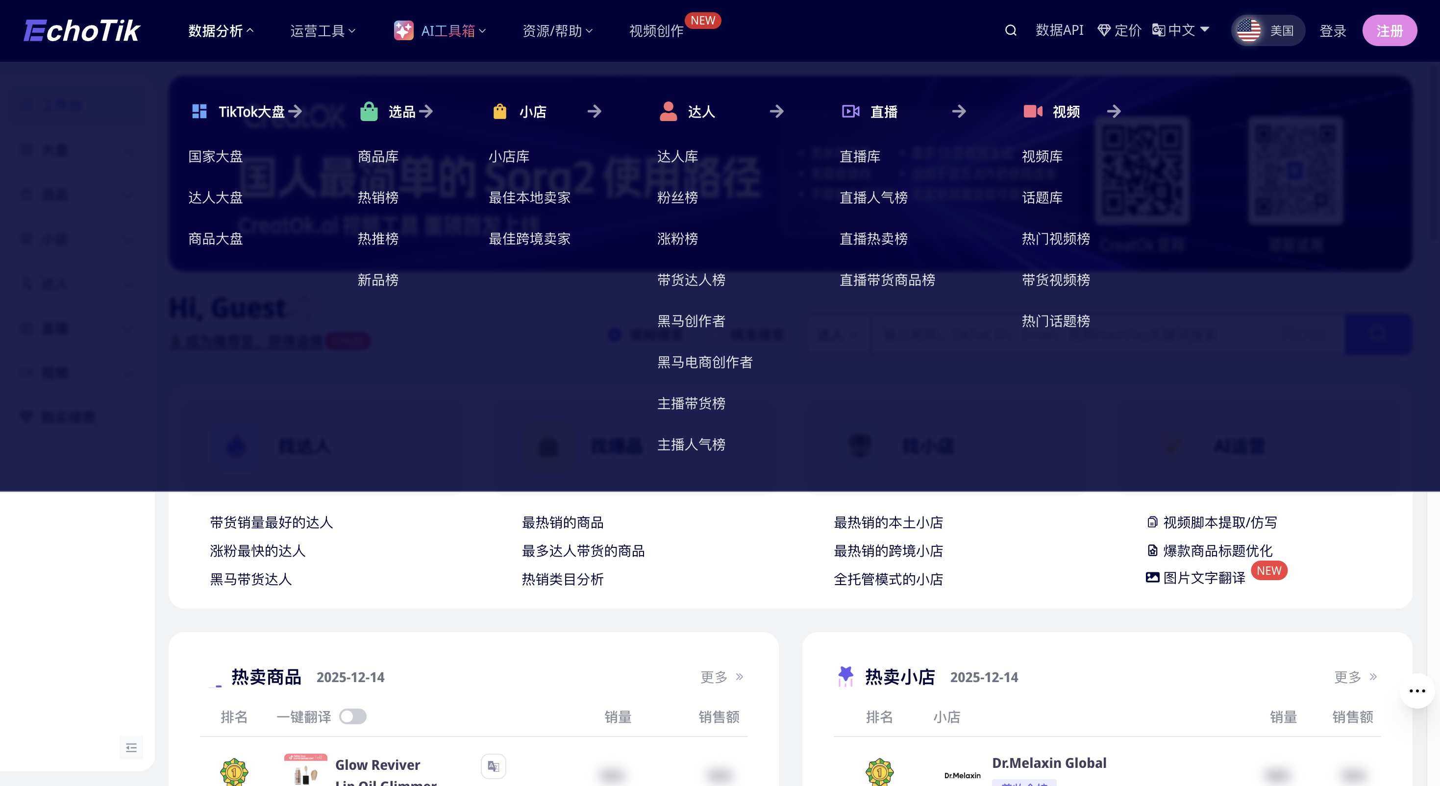 EchoTik 是目前使用率非常高的一款 TikTok数据分析工具,特点是 覆盖面广、维度多,之前工具【嘀嗒狗】的数据分析业务也由这个工具接管了