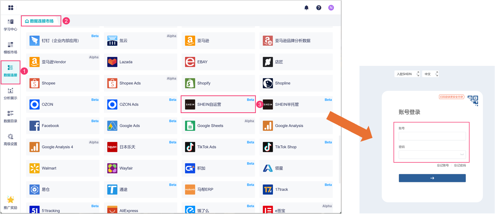 使用数跨境BI直连SHEIN数据十分简单: