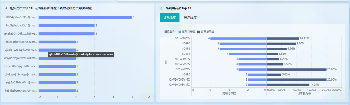 根据SHEIN订单数据中的订单id和用户信息,计算用户回访人数、回访率;复购人数、复购率分析;根据SHEIN订单数据中的商品信息,计算复购top品类、复购top商品等。