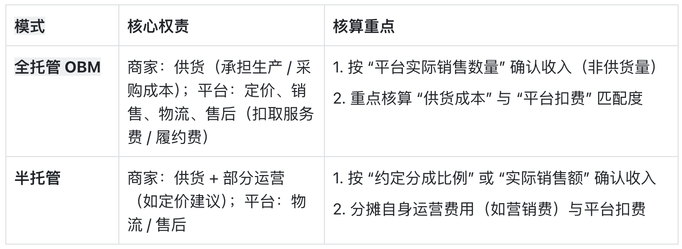 SHEIN主流入驻模式为全托管 OBM(商家供货,平台负责定价、营销、履约),少数为半托管(商家参与部分运营),不同的模式财务核算存在差异。