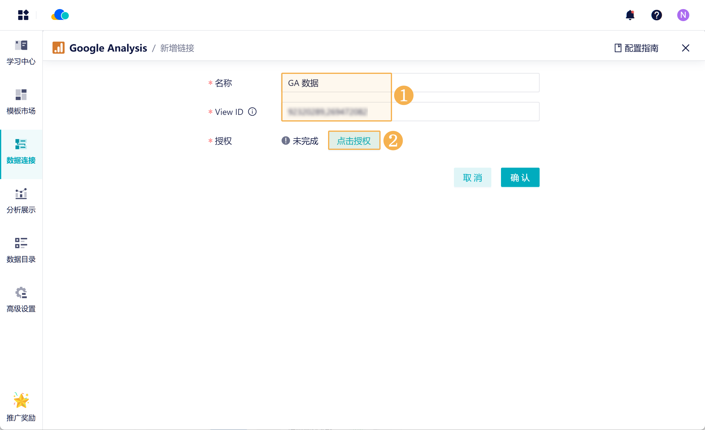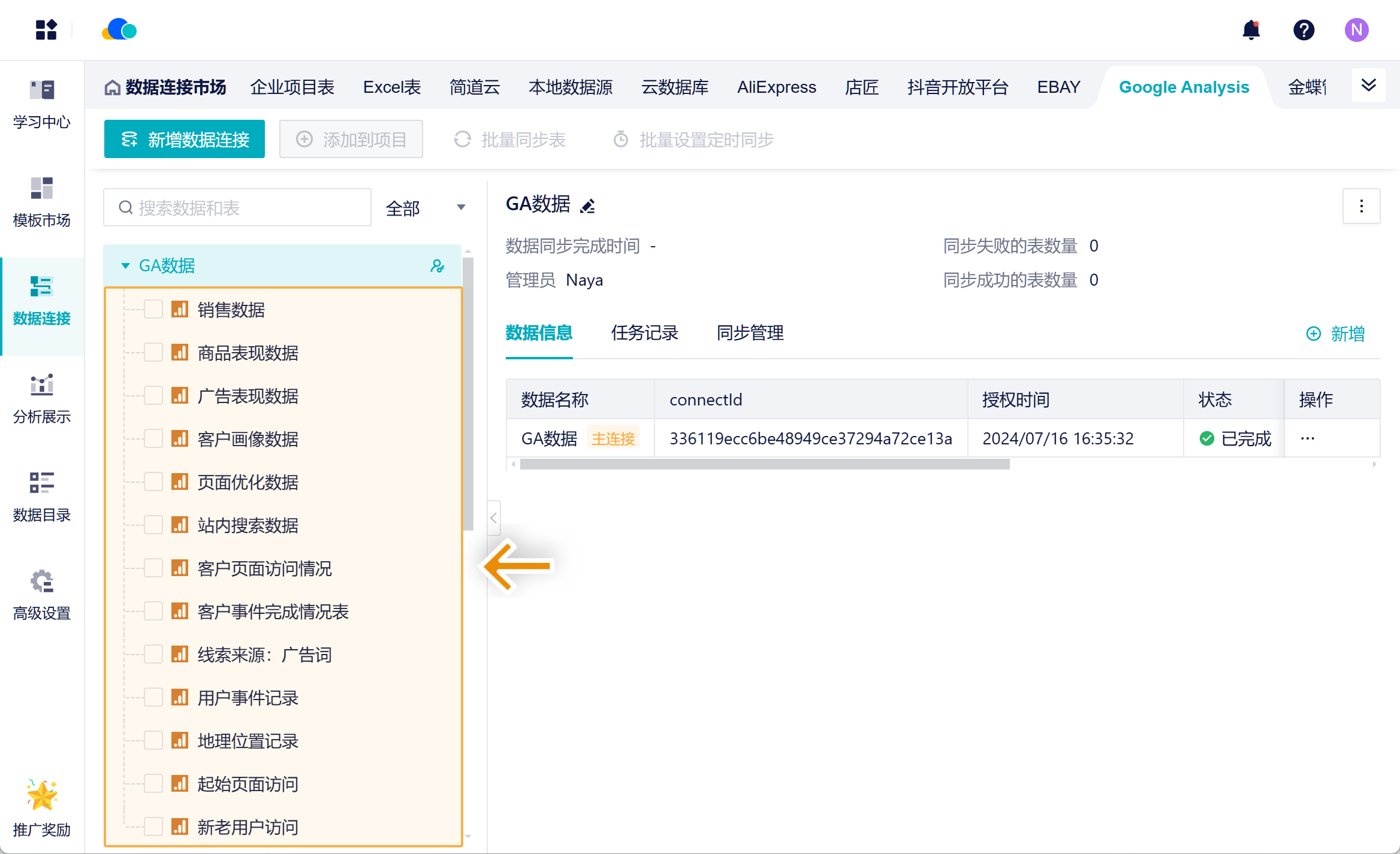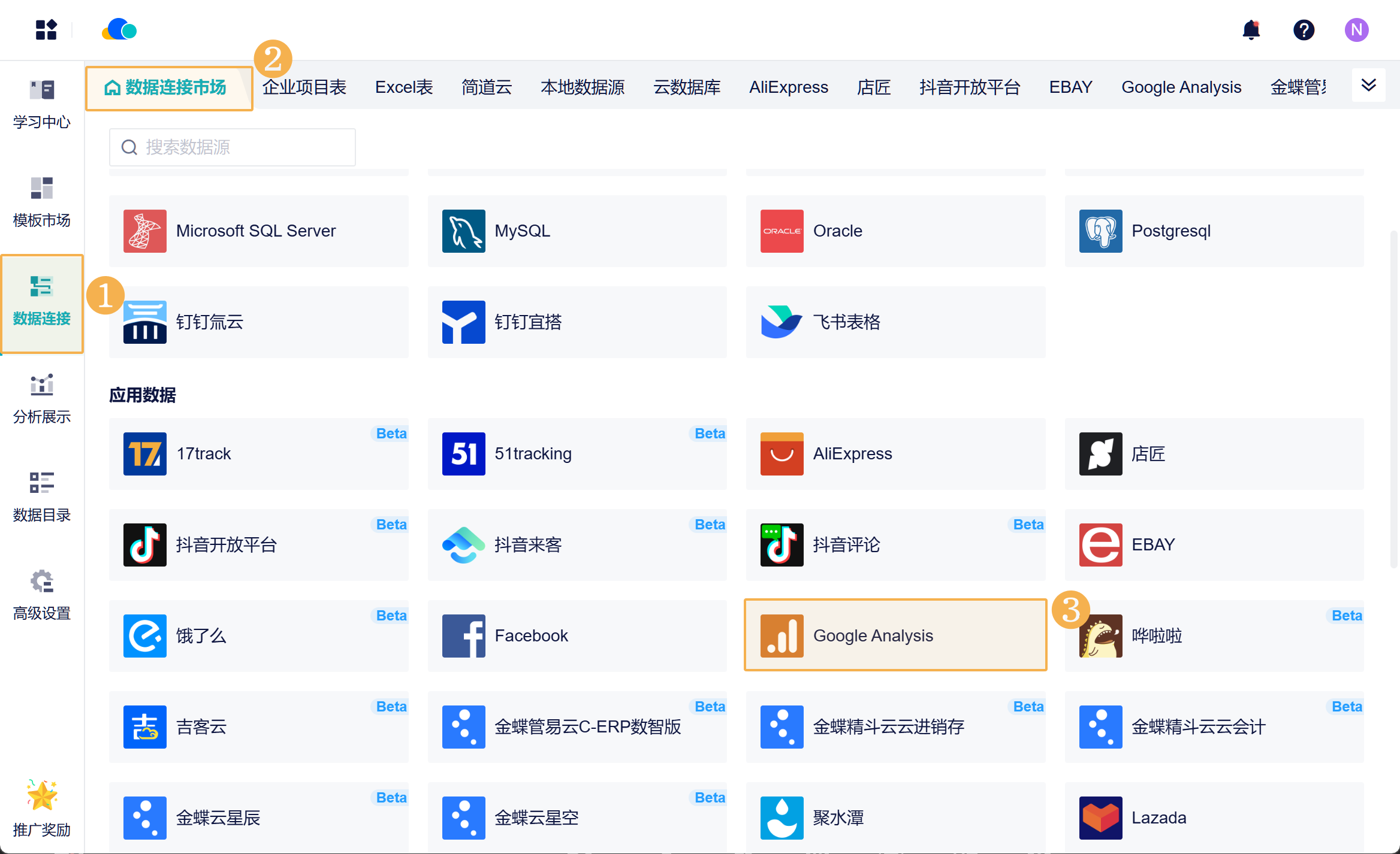 3)进入数跨境BI数据连接市场,新增「Google Analytics」数据源。