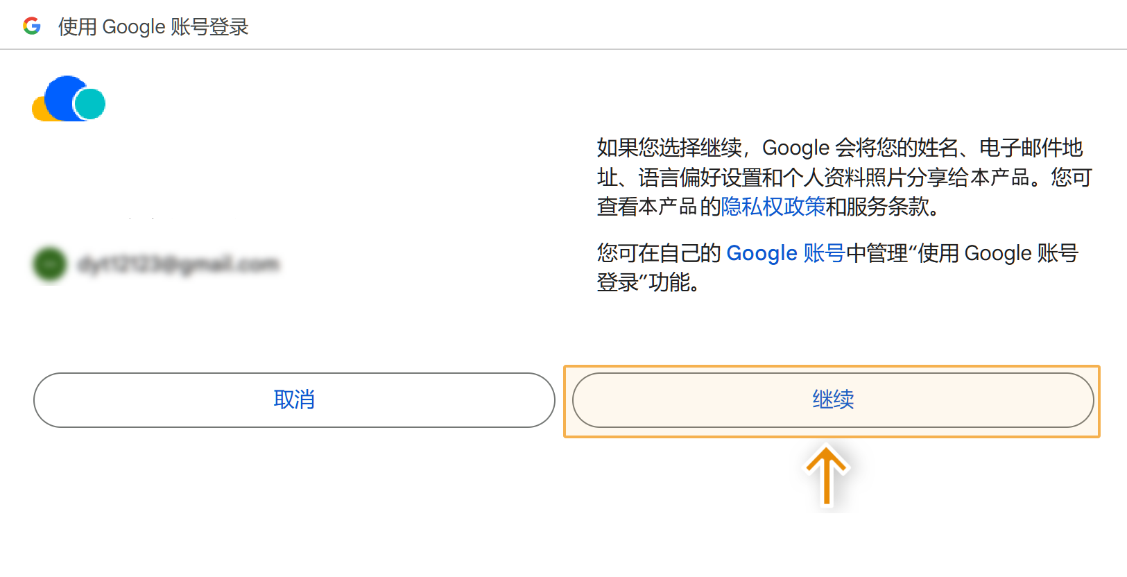 5)输入自己的账号、密码登录谷歌。在授权页面,请选择「继续」,将相关信息授权给本产品。