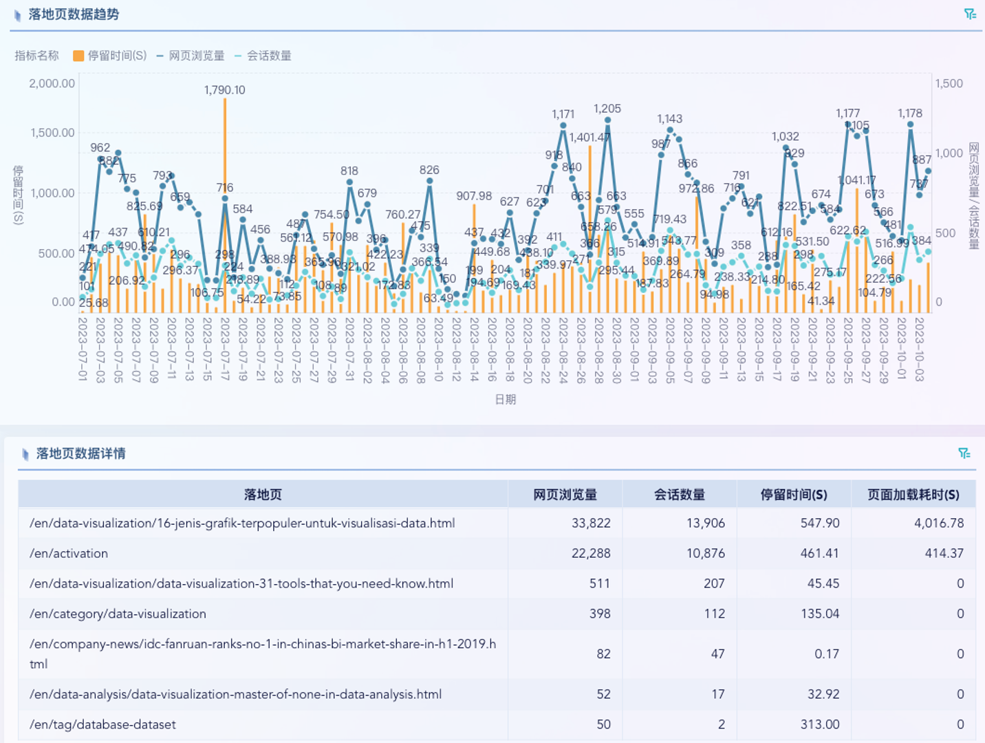 - 趋势分析:重点关注停留时间、浏览量、会话数三项指标,反映页面吸引力与互动情况。