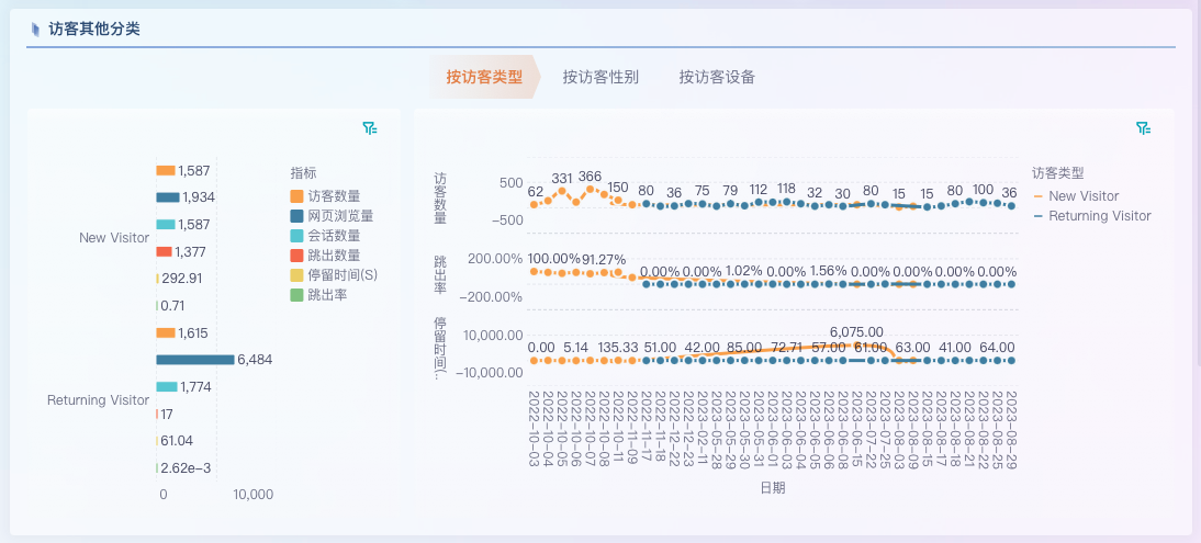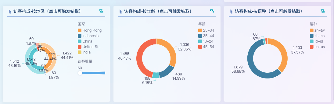 访客不仅可以按地区或语言划分,还可以从 用户类型、性别、访问设备 等维度深入分析:
